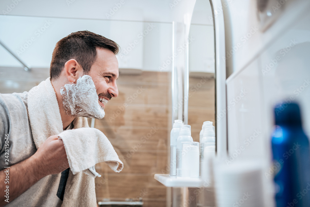 Obraz na plátně Portrait of a handsome man with shaving cream on his face and towel while standing in the bathroom, looking at mirror