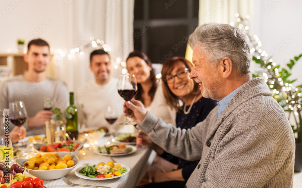 Obraz na plátně celebration, holidays and people concept - happy family having dinner party, dri