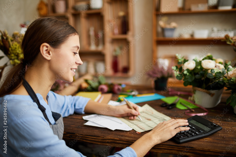 Obraz na plátně Side view portrait of female businesswoman counting finances using calculator in