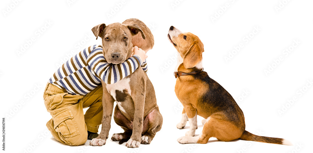 Obraz na plátně Little boy playing with his dogs isolated on white background
