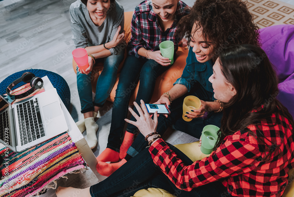 Obraz na plátně Cheerful women watching at screen of smartphone