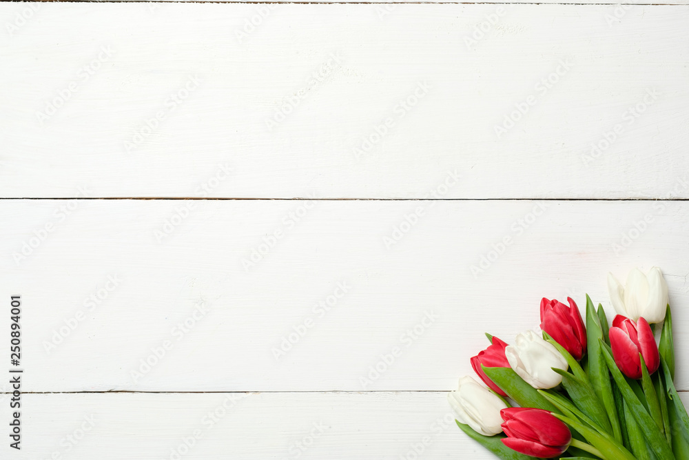 Obraz na plátně Bouquet of tulips at right corner on white wooden background