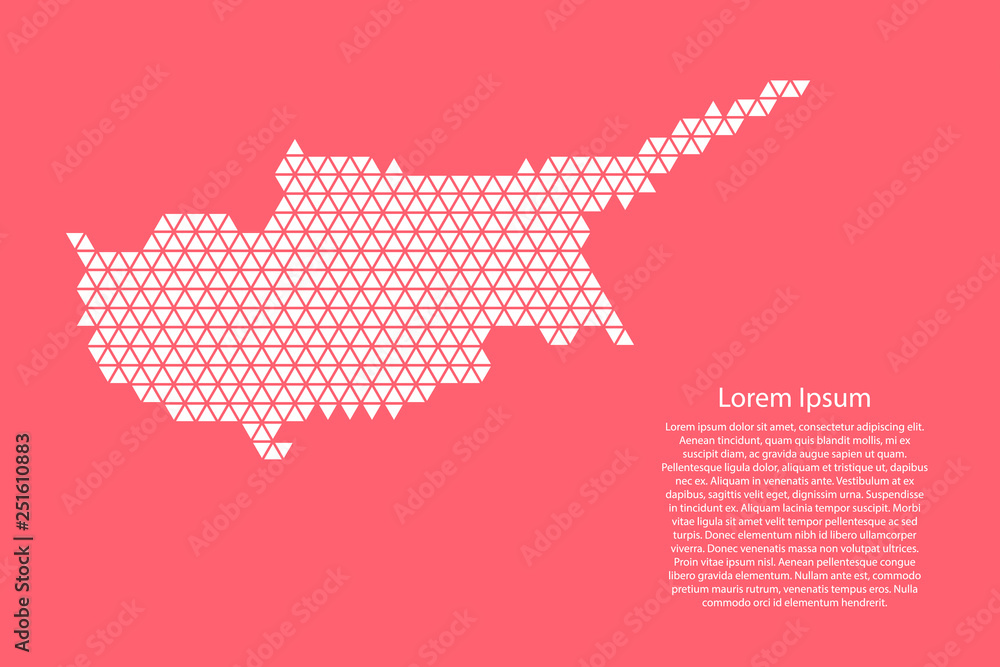 Obraz na plátně Cyprus map abstract schematic from white triangles repeating pattern geometric on pink coral color background with nodes for banner, poster, greeting card