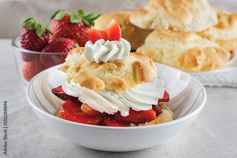 Obraz na plátně Strawberry shortcake in shallow white bowl with whipped cream and garnished with a sliced strawberry