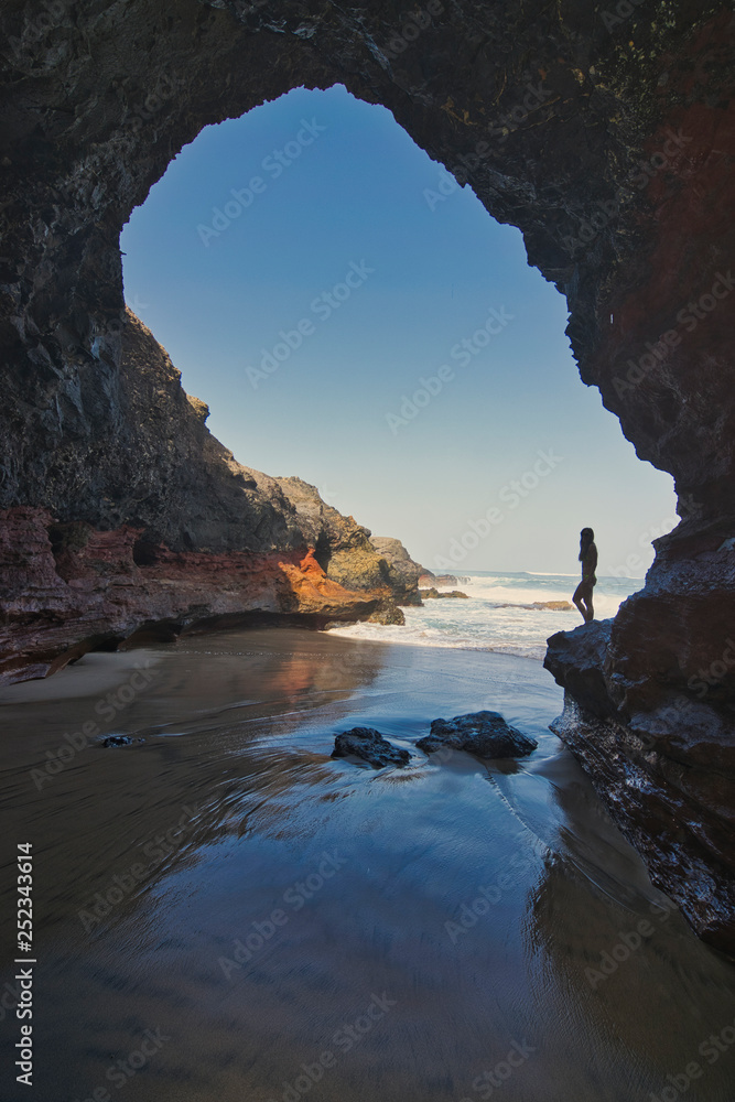 Obraz na plátně Mujer en una cueva con una play paradisíaca
