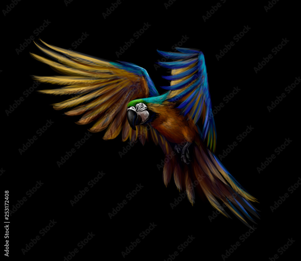 Obraz na plátně Portrait blue-and-yellow macaw in flight on a black background