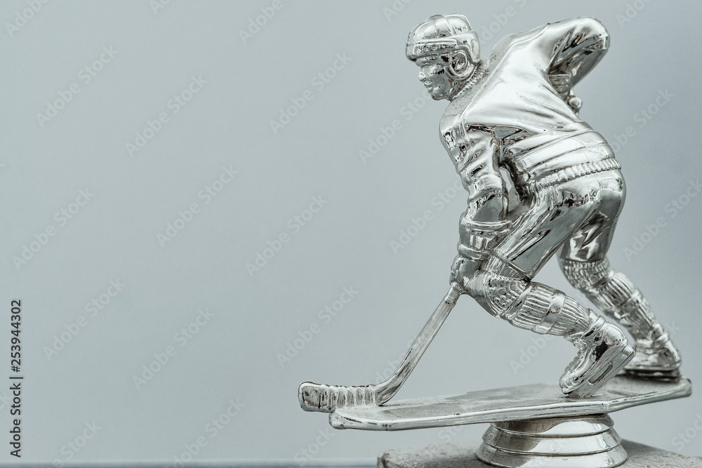 Obraz na plátně Shining silver metal statue of ice hockey in front gates with dramatic light and dust particles in the air