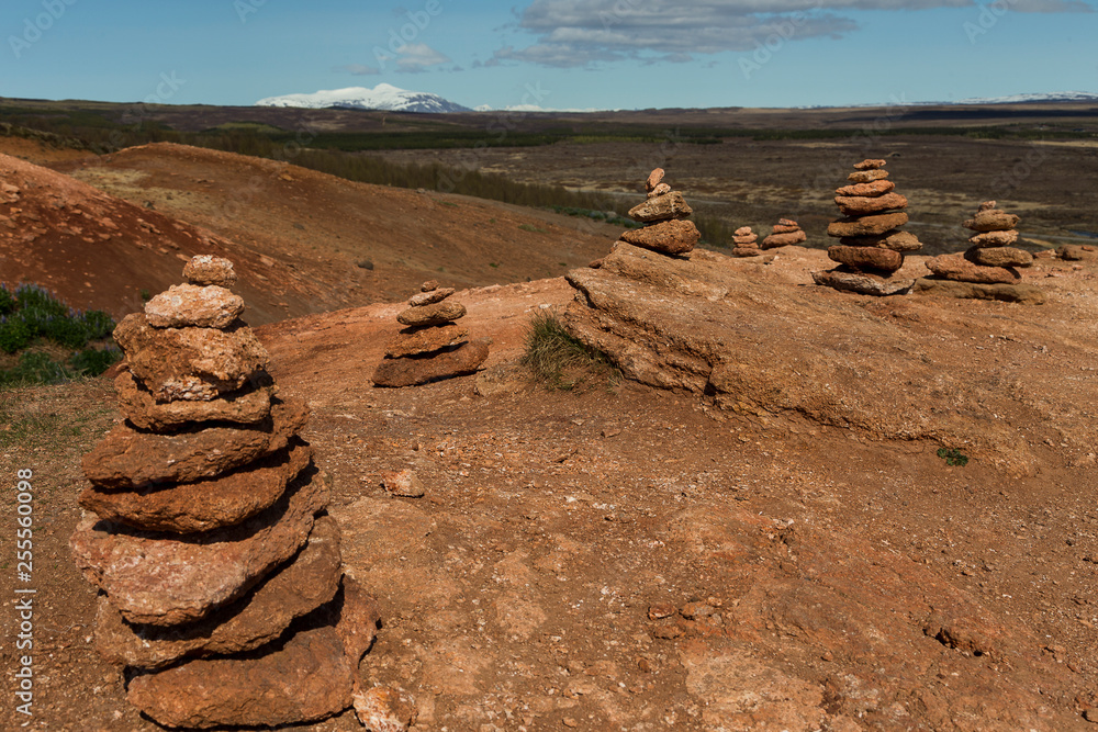 Obraz na plátně Series of red rock cairns near the Geysir Hot Springs in the Golden Circle area