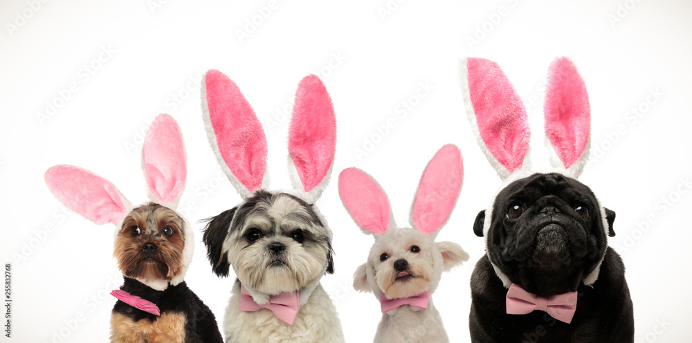 Obraz na plátně four cute little dogs wearing bunny ears for easter