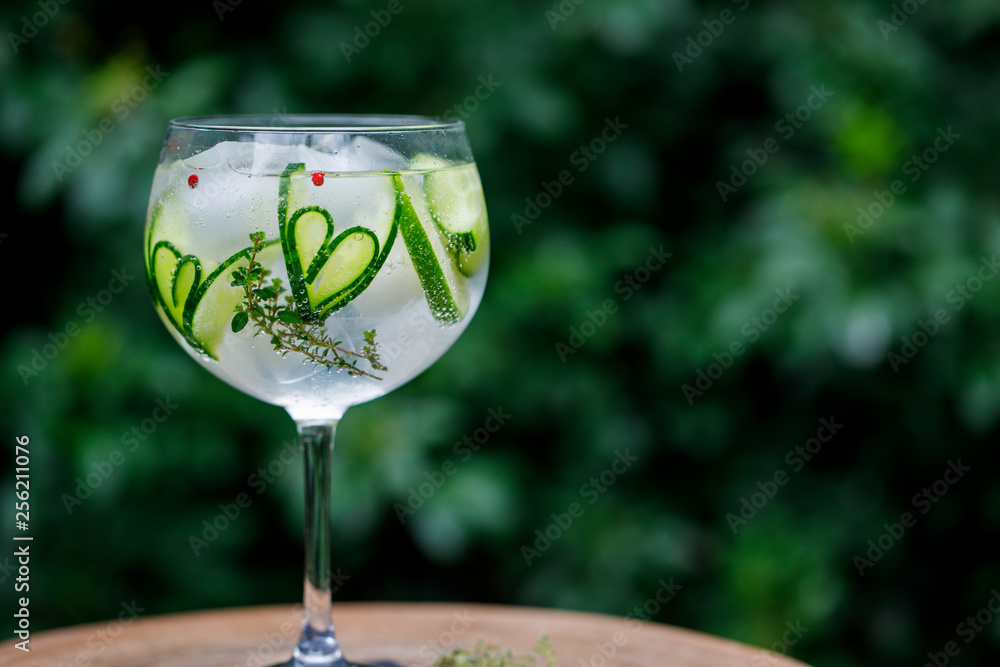Obraz na plátně Gin and tonic with cucumber hearts and thyme