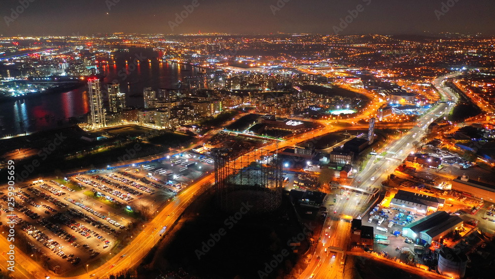 Obraz na plátně Aerial drone night shot from iconic Greenwich Peninsula in the heart of London,
