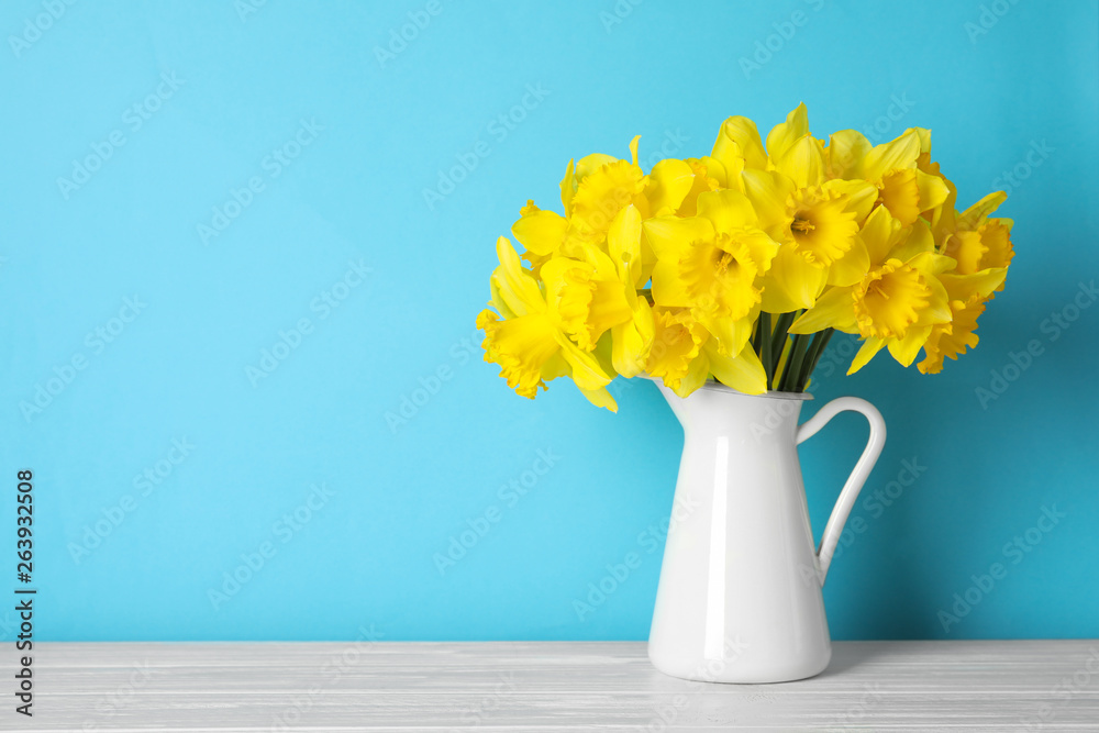Obraz na plátně Bouquet of daffodils in jug on table against color background, space for text