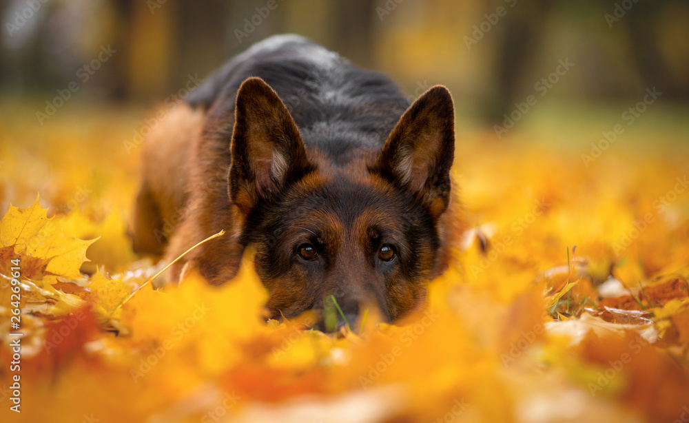 Obraz na plátně Dog breed German shepherd autumn lies in maple yellow leaves