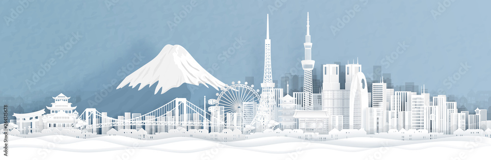 Obraz na plátně Panorama view of Tokyo city skyline with world famous landmarks of Japan in paper cut style vector illustration