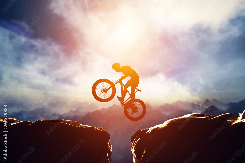 Obraz na plátně Man jumping with bike between two high mountains