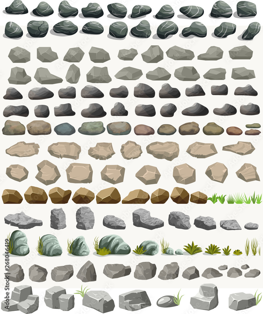 Obraz na plátně Rock stone set with grass cartoon in flat style. Vector
