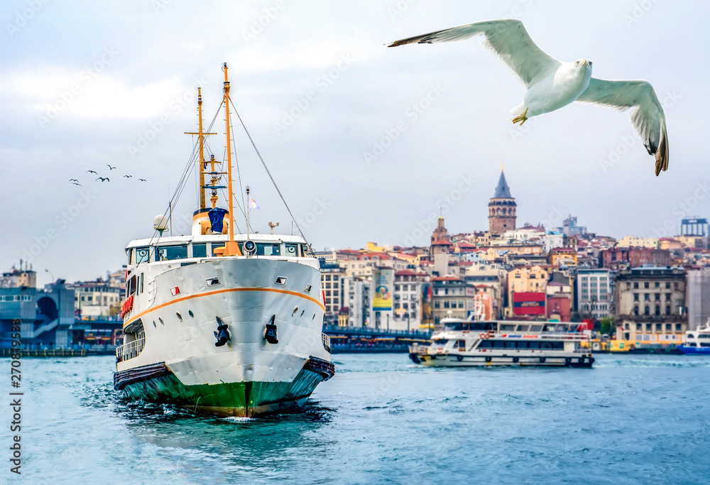 Obraz na plátně Muslim architecture and water transport in Turkey - Beautiful View touristic landmarks from sea voyage on Bosphorus