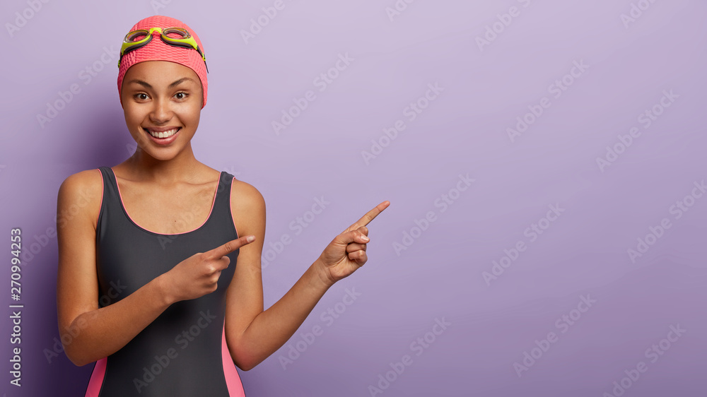 Obraz na plátně Fit female swimmer wears swimcap and goggles, points aside with index fingers, shows direction somewhere, has glad expression, recreats during summer holidays in leisure center