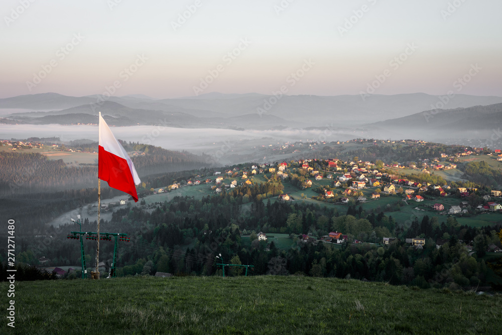 Obraz na plátně Waving Polish flag in the mountains above the village