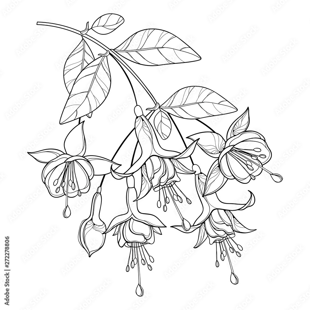 Obraz na plátně Branch of outline Fuchsia ornate flower bunch, bud and leaf in black isolated on white background