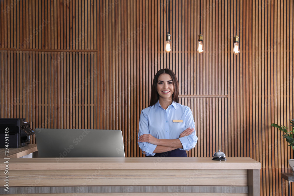 Obraz na plátně Portrait of receptionist at desk in lobby