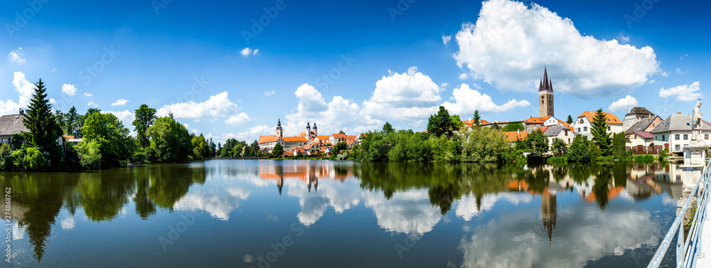 Obraz na plátně View of Telc across pond with reflections, Unesco world heritage site, South Moravia, Czech Republic