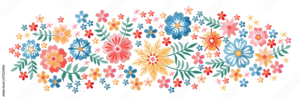 Obraz na plátně Horizontal pattern with colorful embroidered flowers on white background