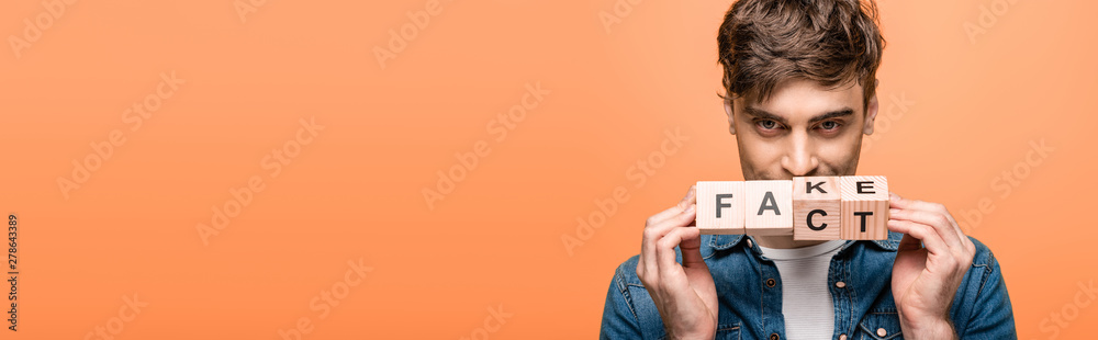 Obraz na plátně panoramic shot of positive man showing wooden cubes with fake fack lettering iso