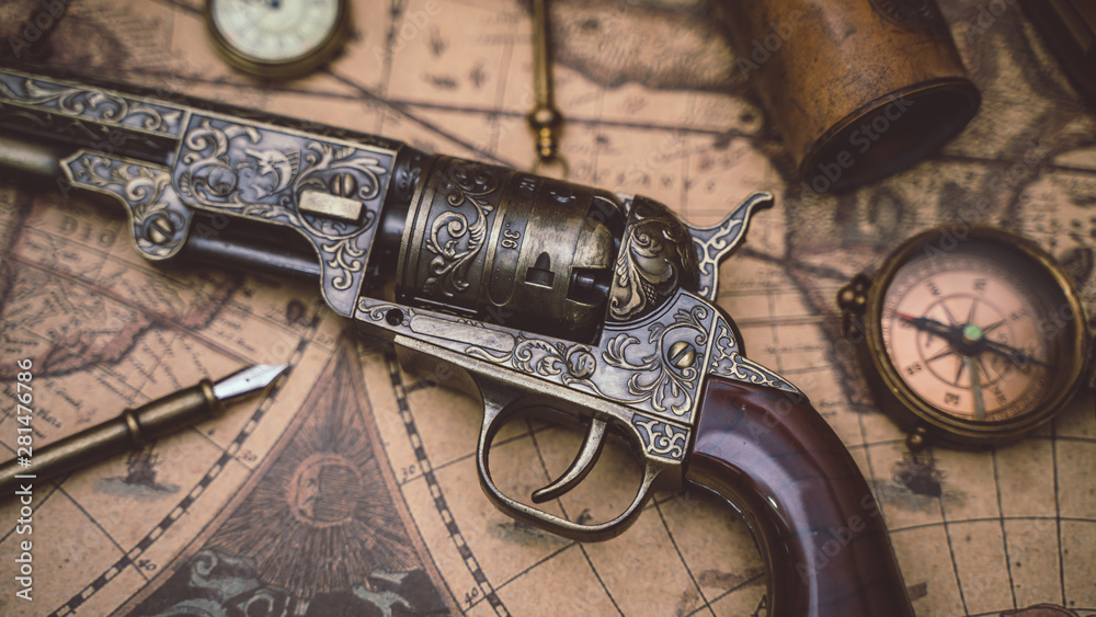 Obraz na plátně Vintage Pistol Gun And Compass