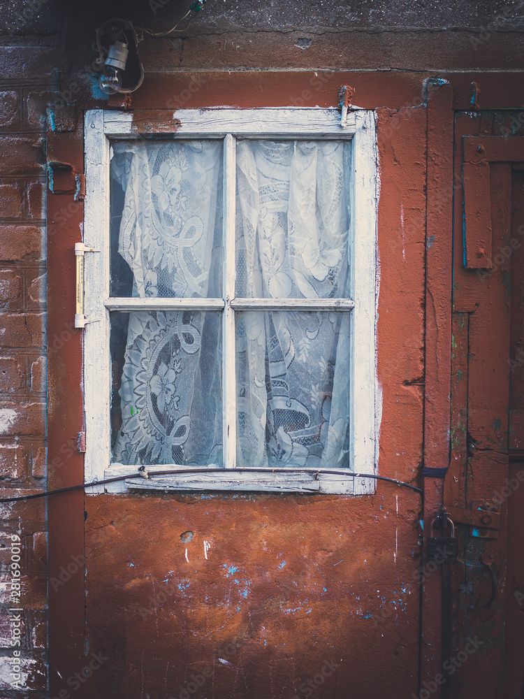 Obraz na plátně Facade of an old building, red wall with white window and curtain