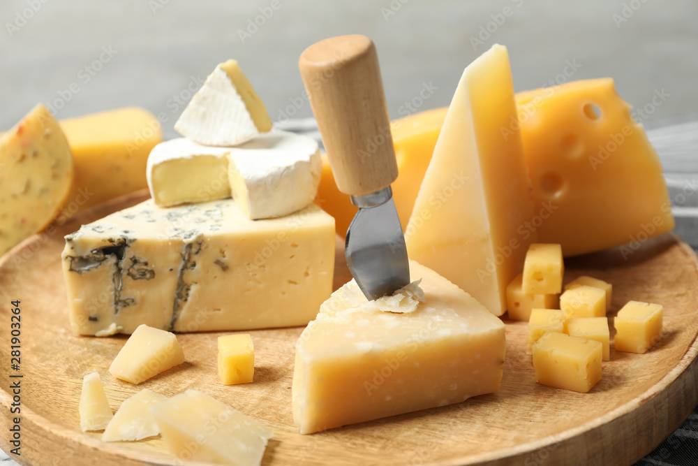 Obraz na plátně Different types of delicious cheese in wooden plate, closeup