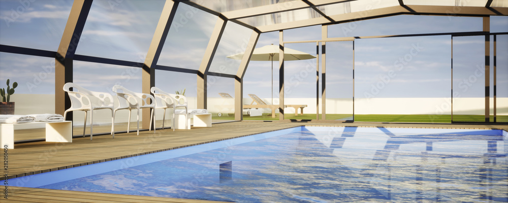 Obraz na plátně vue 3d abri de piscine et terrasse bois 02
