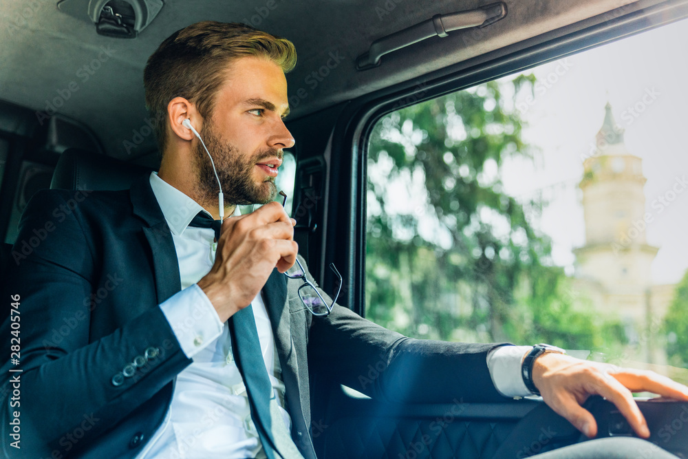 Obraz na plátně Thoughfull businessman wearing earphones and listening musing while driving in a