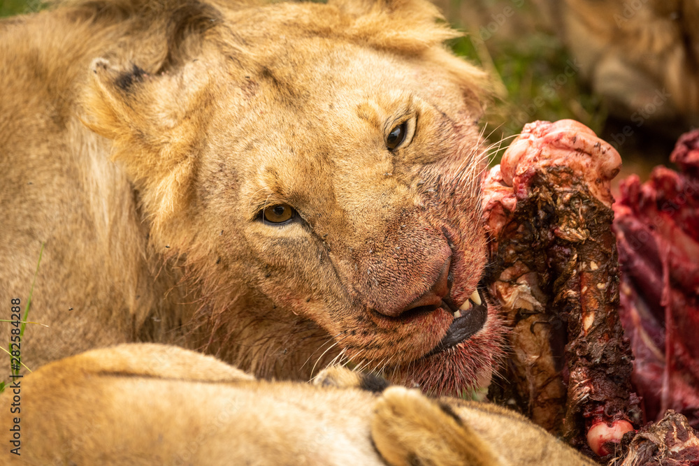 Obraz na plátně Close-up of lion chewing bones of carcase