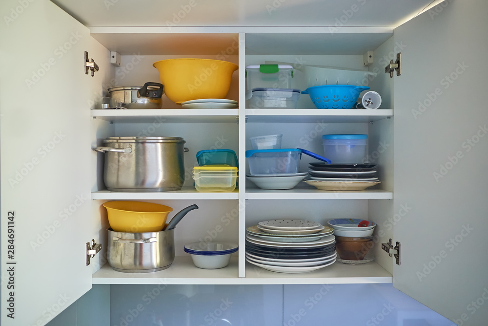 Obraz na plátně opened white kitchen cupboard with plates, metal pots and food containers