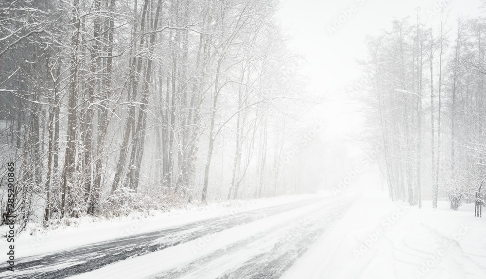 Obraz na plátně Snowy winter road during blizzard in Latvia