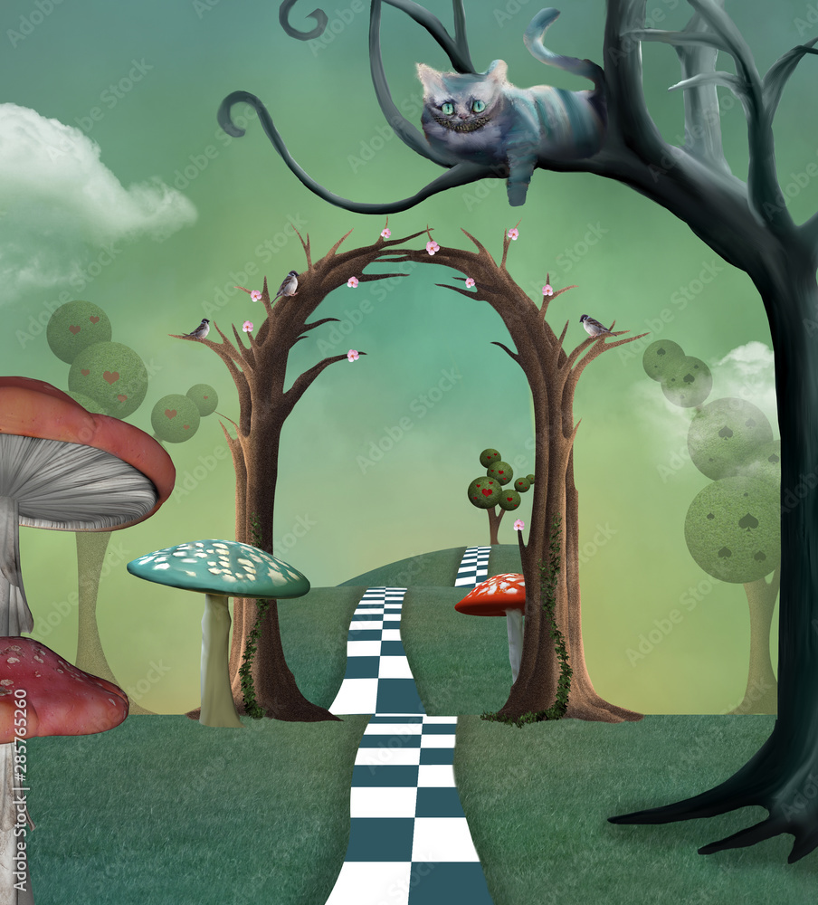 Obraz na plátně Wonderland series - Surreal countryside view with a secret passage and cheshire