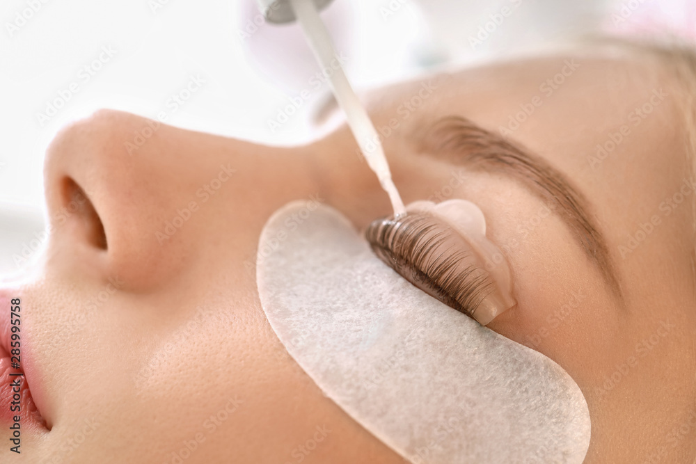 Obraz na plátně Young woman undergoing procedure of eyelashes lamination in beauty salon, closeu