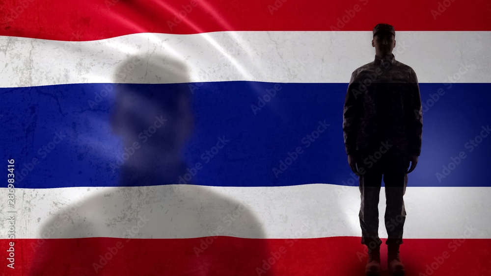 Obraz na plátně Thai soldier silhouette standing against national flag, proud army sergeant