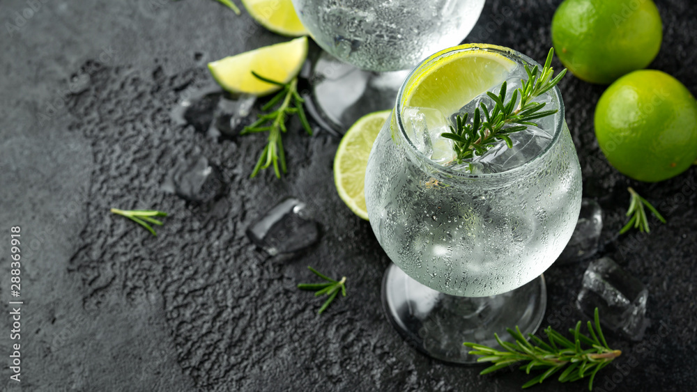 Obraz na plátně Gin and Tonic Alcohol drink with Lime, Rosemary and ice on rustic black table