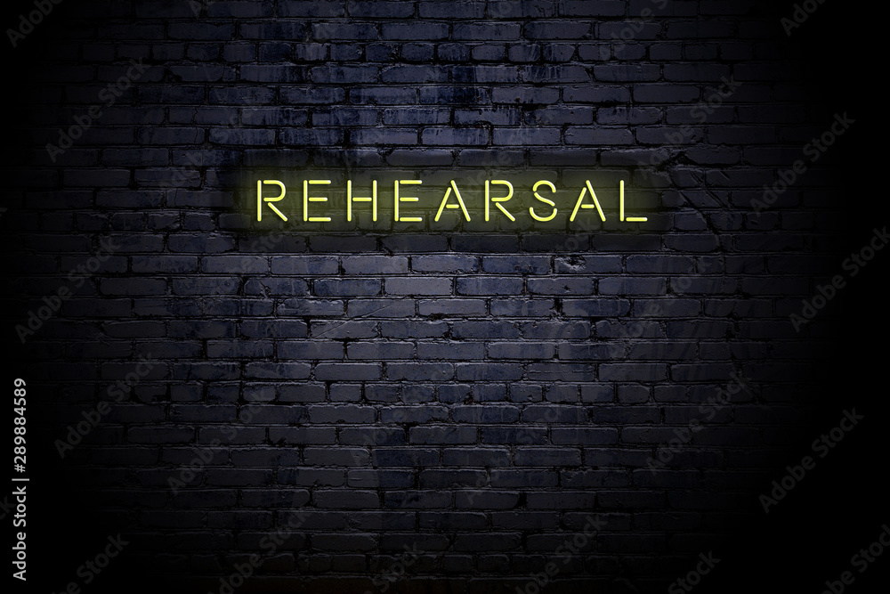 Obraz na plátně Highlighted brick wall with neon inscription rehearsal
