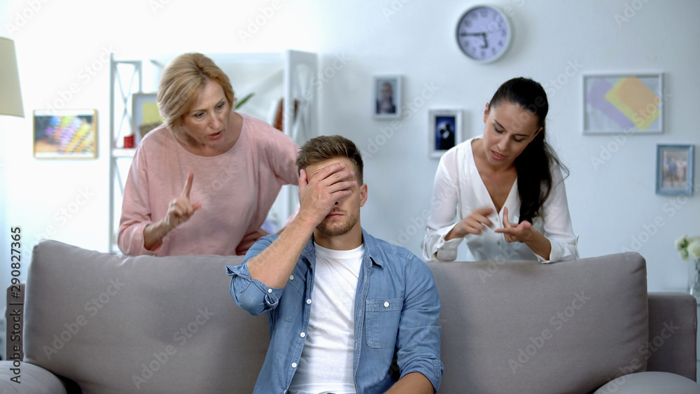Obraz na plátně Tired man sitting on sofa, enduring to wife and mother criticize him, quarrel