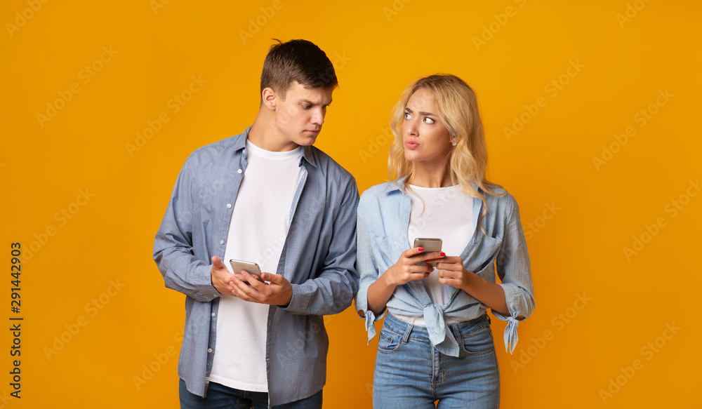 Obraz na plátně Jealous guy looking at girlfriend's cellphone, reading her messages