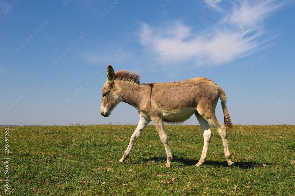 Obraz na plátně Oslík na pastvině nad modrou oblohou