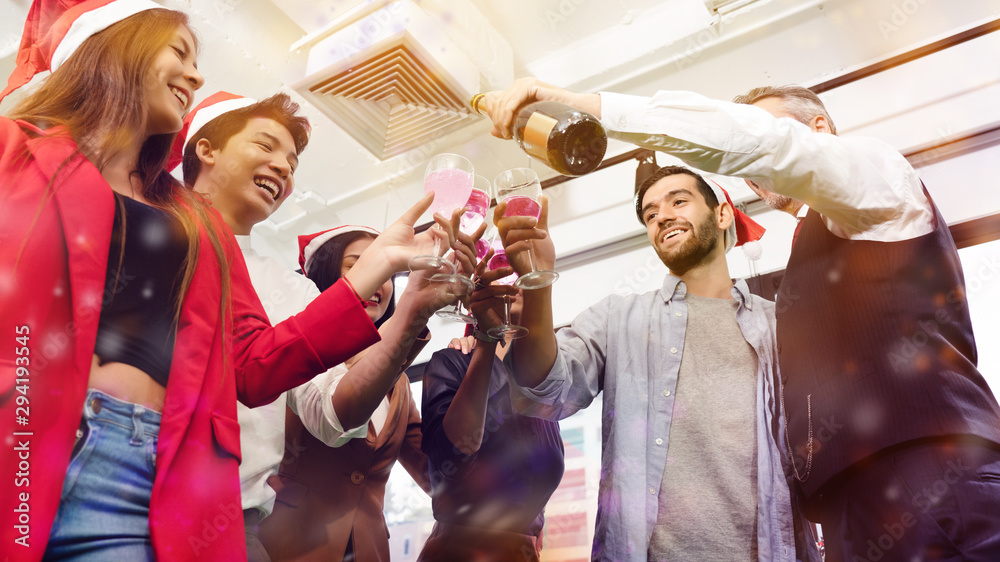 Obraz na plátně Group of office workers are celebrating Christmas party and happy new year by drinking champagne wine happily during the annual long break of the company And glad that the salary increases