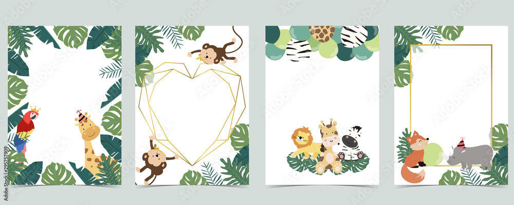 Obraz na plátně Green collection of jungle frame set with leaf,leaves,parrot,monkey,balloon vect
