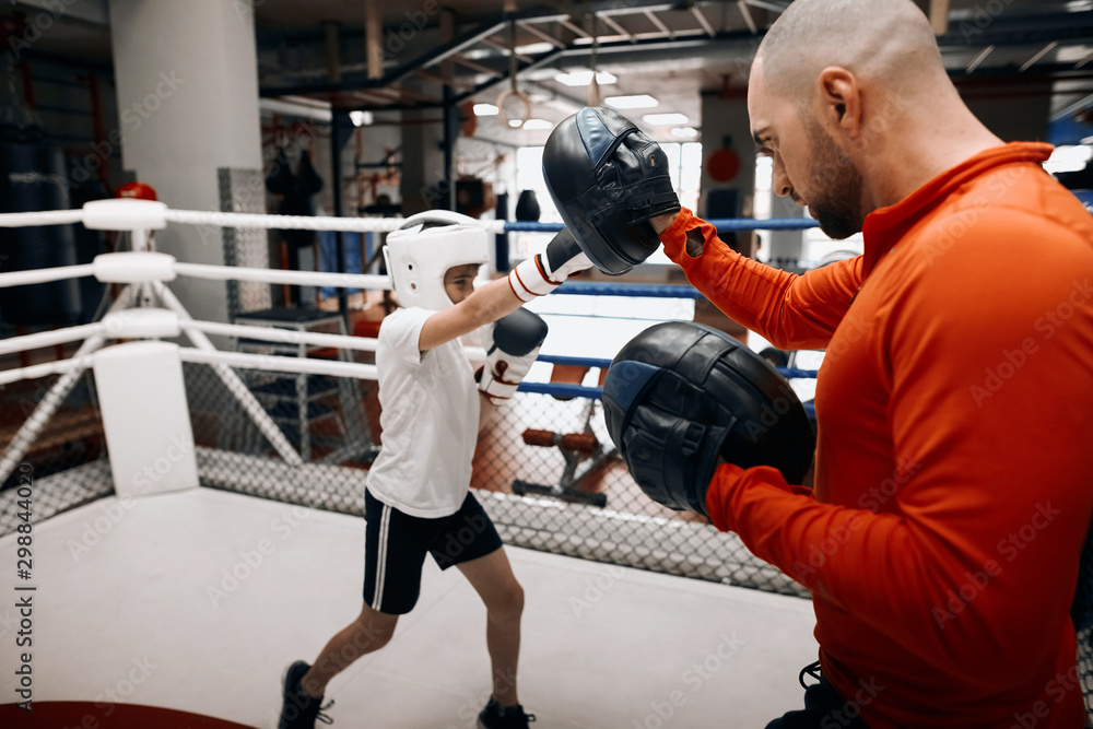 Obraz na plátně little boy learning kickboxing at sport club, close up photo