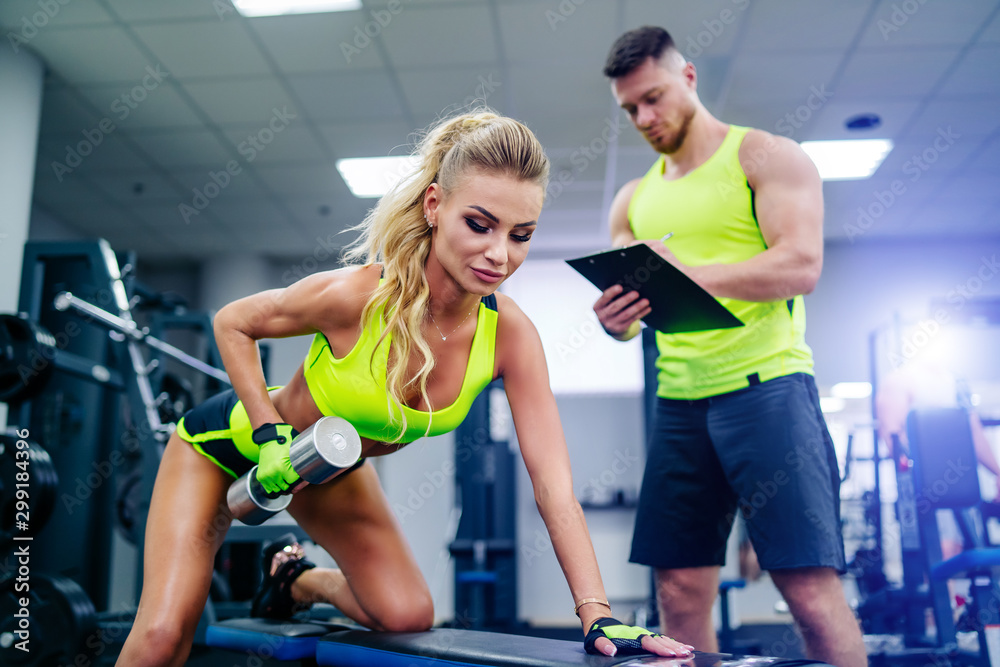 Obraz na plátně Trainer and client doing workout at gym with dambbell