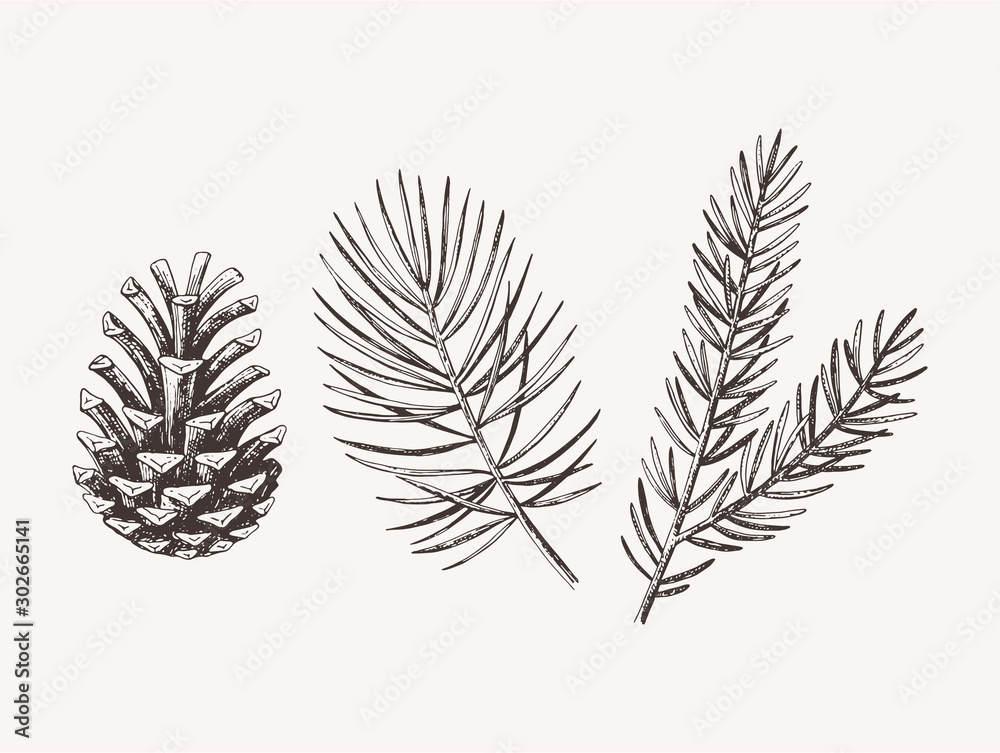 Obraz na plátně Hand drawn conifer branches and cones