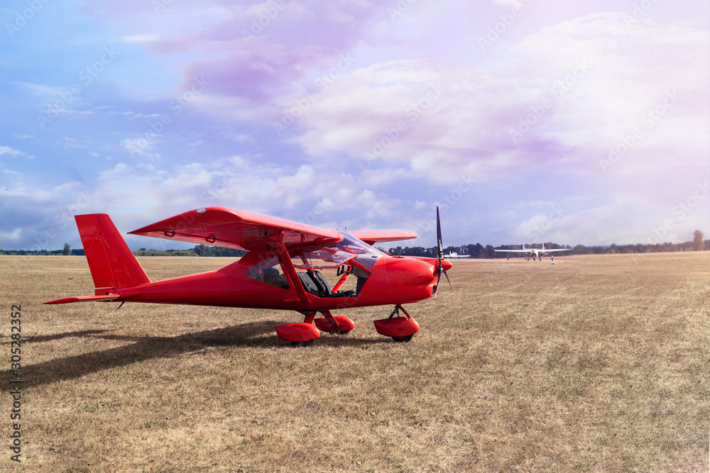 Obraz na plátně Small private red aircrafts parked at ground at pink sunset